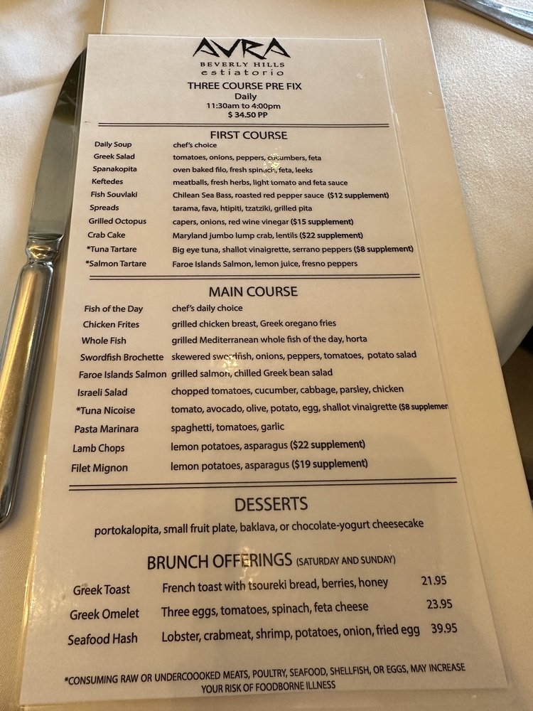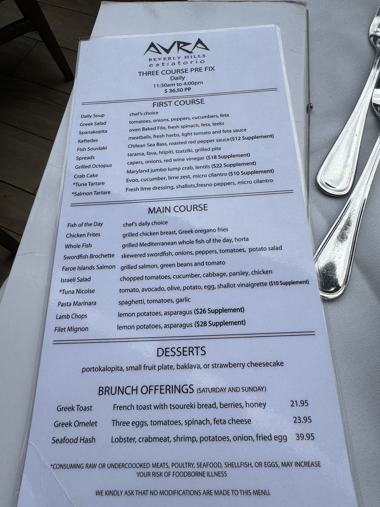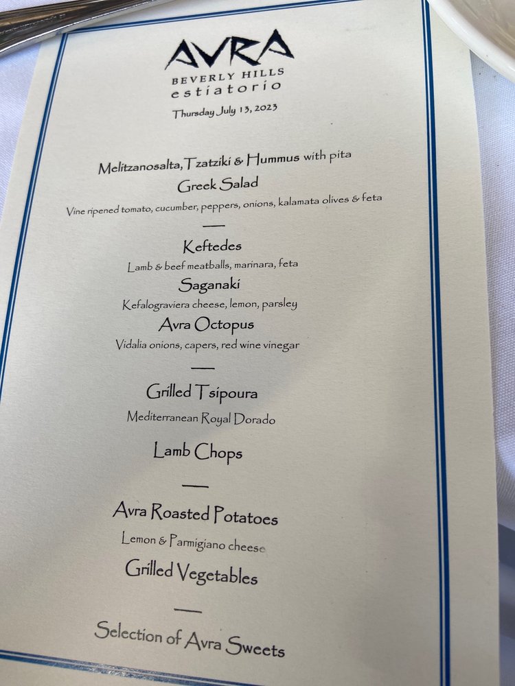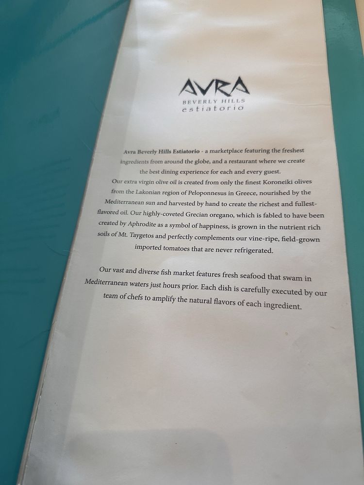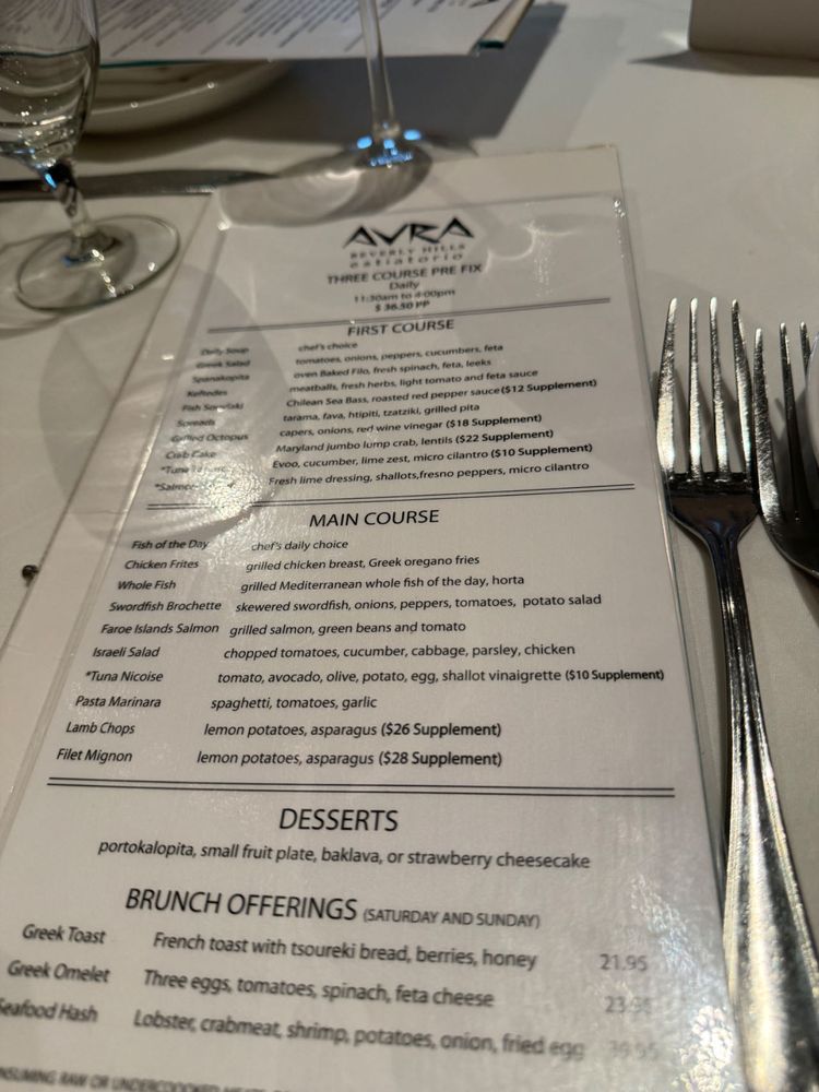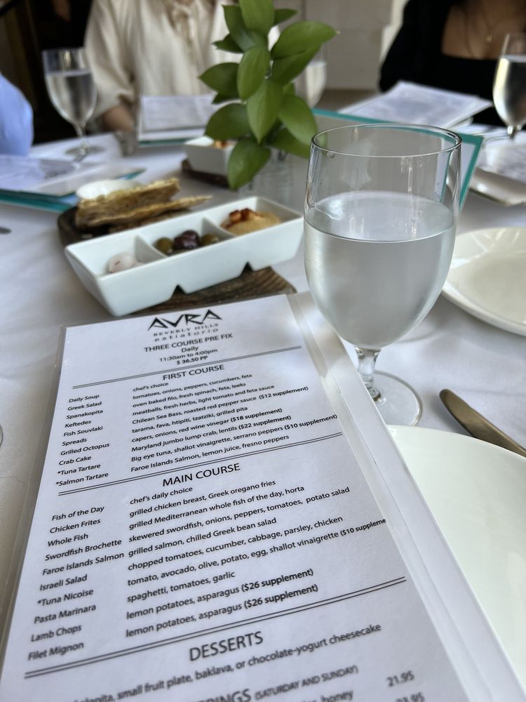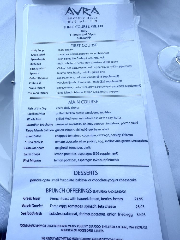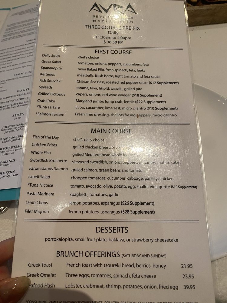 Introducing the menu at Avra Beverly Hills, a Greek-Mediterranean seafood restaurant nestled in Beverly Hills, CA. Offering a plethora of vegan and vegetarian options, this upscale and trendy spot boasts fresh fish flown in from around the world. Customers rave about the sea bass kebab, grilled whole fish, and decadent desserts like olive oil cake and chocolate cake. The appetizers, including hummus and crackers, are a hit, making every penny worth it. The atmosphere is lively, with attentive servers and a vibrant ambiance. With options like a pre fixe menu for lunch and a variety of cocktails, Avra Beverly Hills is a perfect spot for a special meal or a splurge night out. Don't miss out on the impeccable service and exquisite dishes this restaurant has to offer.